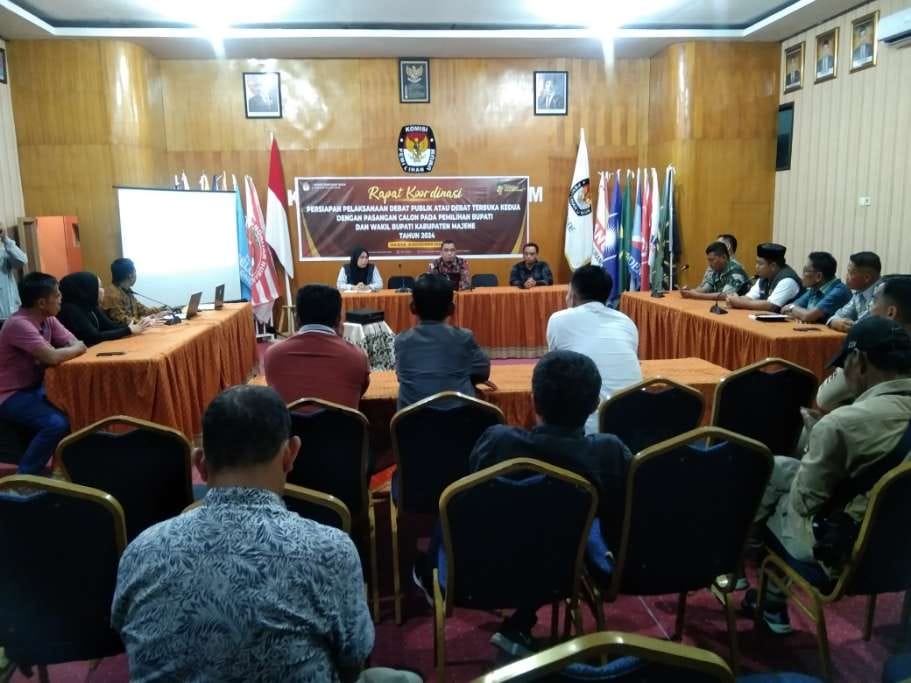 Pesisirmandar.com, Majene – Komisi Pemilihan Umum (KPU) Kabupaten Majene mengadakan rapat koordinasi persiapan pelaksanaan debat publik kedua untuk pasangan calon Bupati dan Wakil Bupati Kabupaten Majene dalam Pilkada 2024.