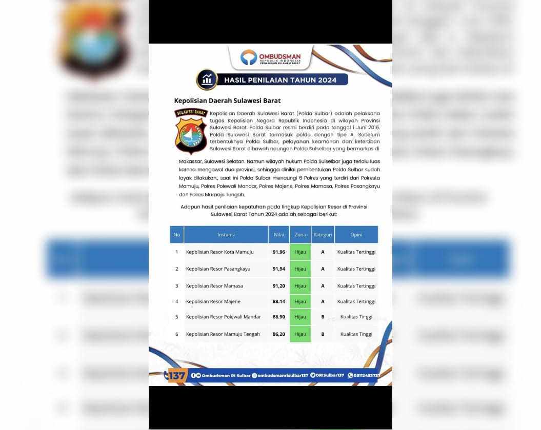 Berdasarkan hasil penilaian yang dirilis Ombudsman, tiga Polres di Sulbar mendapat predikat kategori A dengan opini “Kualitas Tertinggi,” yakni: