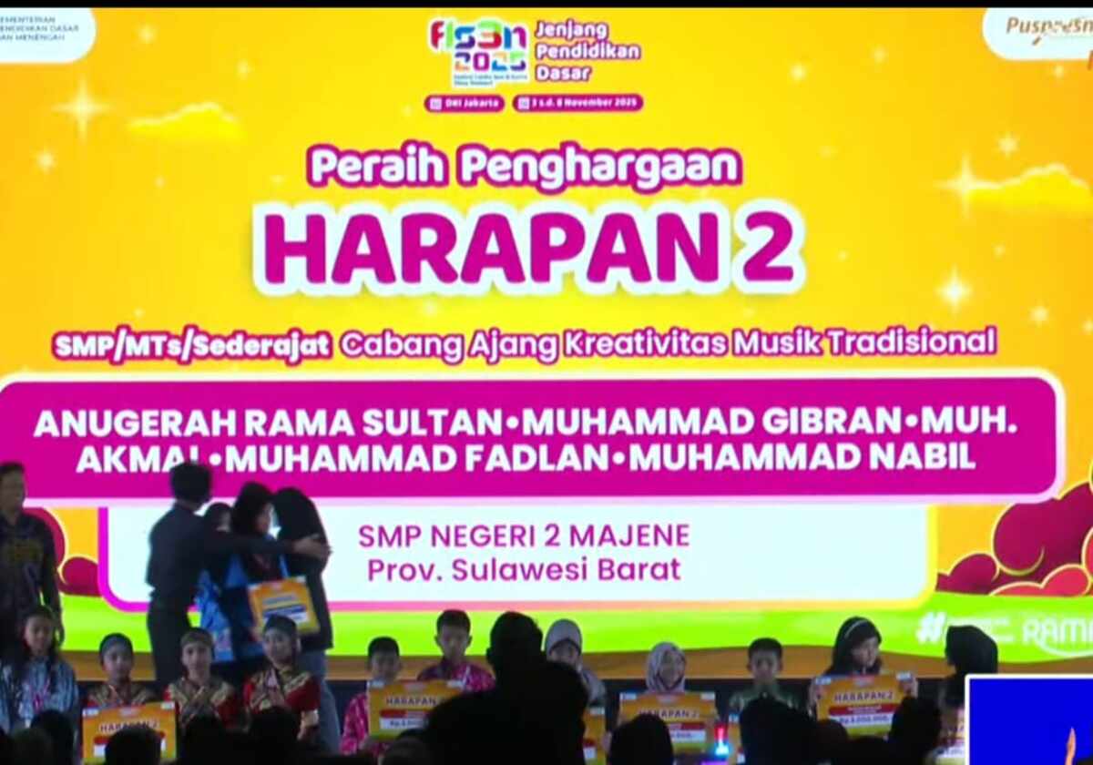 pesisirmandar.com, Majene – Kepala Dinas Pendidikan, Pemuda, dan Olahraga (Kadisdikpora) Kabupaten Majene, Andi Asraf Tammalele, mengapresiasi prestasi tim kreativitas musik tradisional SMPN 2 Majene yang berhasil meraih Juara Harapan II pada ajang Festival dan Lomba Seni Siswa Nasional (FLS2N) 2025. Kompetisi tersebut berlangsung di Jakarta, Senin, 10 November 2025.